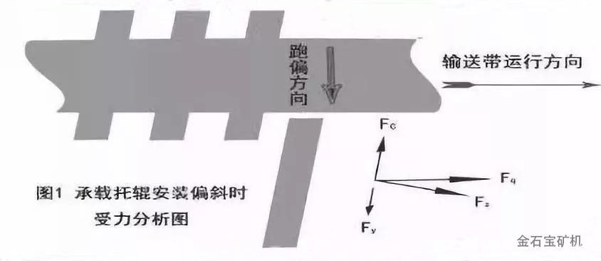 滚筒偏斜时,输送带在滚筒两侧的松紧度不一致,沿宽度方向上所受的牵引力,FQ也就不一致,呈递增或递减趋势,这样就会使输送带附加一个向递减方向的移动Fy,导致输送带向松的一侧跑偏。