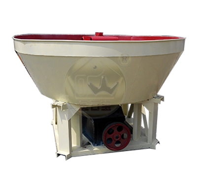 该设备主要动力装置、机架、水盆、碾轮、碾盘等部件组成,采用轮动式磨矿工作方式:首先电动机将动力传动至减速机,在减速机带动下,通过大立轴将力矩传递给上方的横轴,然后经安装在横轴两端的拉杆传递至碾轮,使碾轮产生驱动力,沿横轴水平方向做逆时针旋转运动;工作时的碾轮既能围绕湿碾机大立轴公转,又能围绕碾轮中心轴进行自转,碾盘则固定不动。添加的矿石物料,在碾磨机内受到来自,碾轮自身重量带来的挤压力,碾轮公转自转时与碾盘产生的巨大摩擦力,在受到反复的挤压、揉搓、研磨后,被彻底粉碎